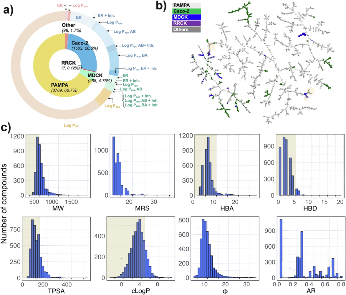 The team's comprehensive molecular analysis, visualized through TMAP (Tree-MAP), reveals a structurally diverse landscape that range from drug-like molecules to more exotic macrocyclic architectures. Figure 4 breaks down permeability data by assay type and endpoints, TMAP visualization maps the structural landscape of 4,216 non-peptide macrocycles, and 2D descriptors capture molecular property distributions across size, polarity, lipophilicity, flexibility, and amide ratios, while Rule of Five and Veber rule boundaries provide context for just how far these molecules venture beyond conventional drug-like space.