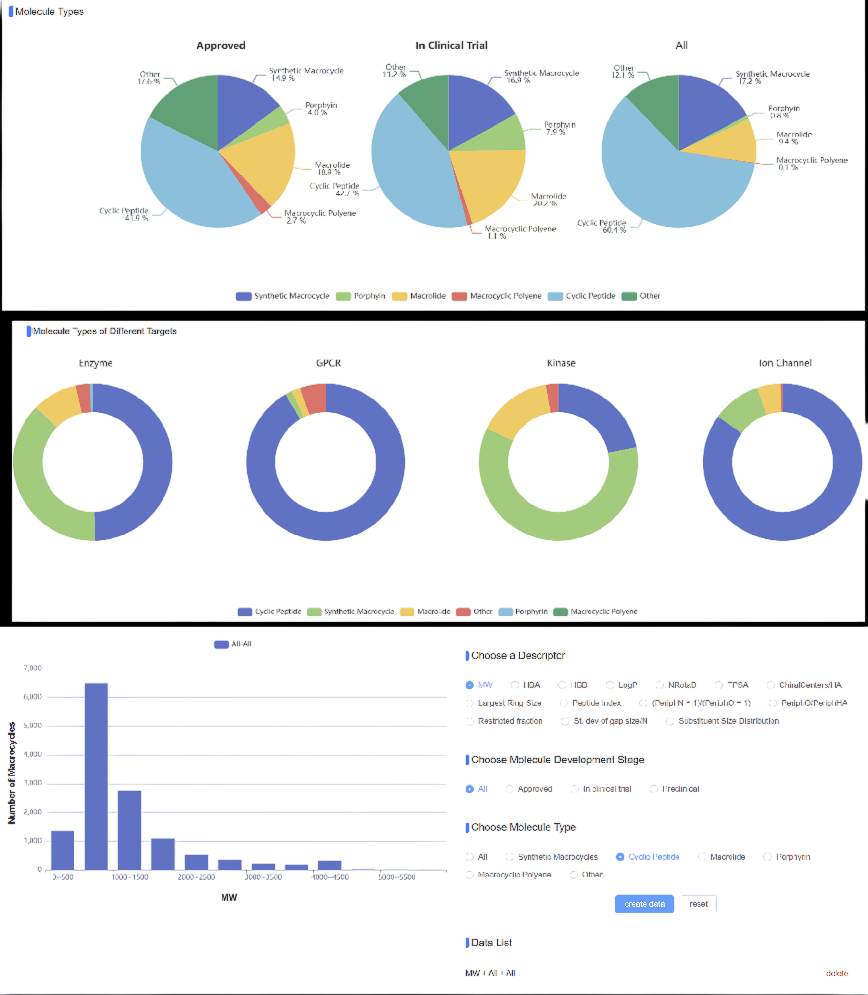 Macrocycle-DB (https://macro-db.dpbio.tech/) embodies a broad perspective, aggregating over 18,000 synthetic macrocycles from major repositories including PubChem, ChEMBL, and clinical databases. While encompassing diverse scaffolds including macrolides, porphyrins, and macropolyenes, cyclic peptides dominates not only as 61% of the collection, but also as 42% of marketed and clinical-stage molecules, virtually monopolizing GPCR and ion channel therapeutics.